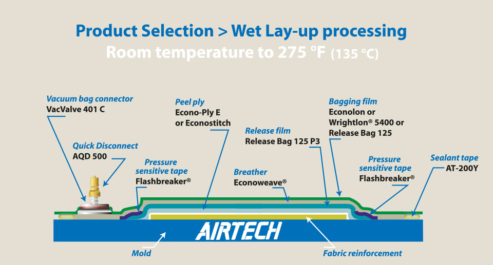 Airtech 产品系列包含真空袋消耗品、真空配件和配套产品,以满足手工层压成型中的真空袋应用。这些产品包括: